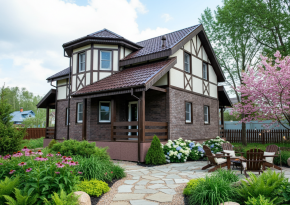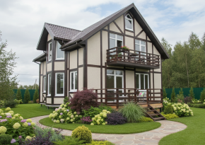 Внутренняя отделка выполнена из натуральной древесины, что придает помещению тепло и уют, а высокие потолки и крупные окна создают ощущение простора и наполненности светом. Дом отлично подойдет для круглогодичного проживания или загородного отдыха всей семьей.