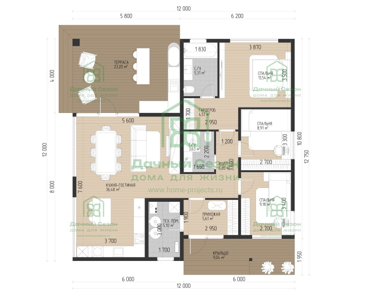«Дерби» — это тот самый одноэтажный дом, где всё логично, просторно и по-взрослому продумано. Без лишних коридоров, без компромиссов между красотой и удобством. Формат 12×12 метров даёт идеальный баланс: дом компактный по пятну застройки, но ощущается значительно больше внутри.
