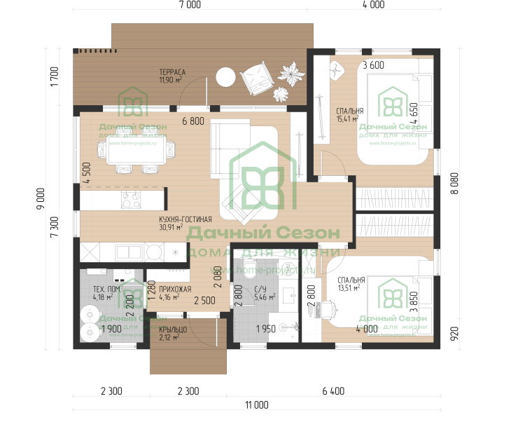 Общая площадь — 86 м², габариты по фундаменту ≈ 9 × 11 м (≈ 11 по ширине с учётом выступов террасы и крыльца).